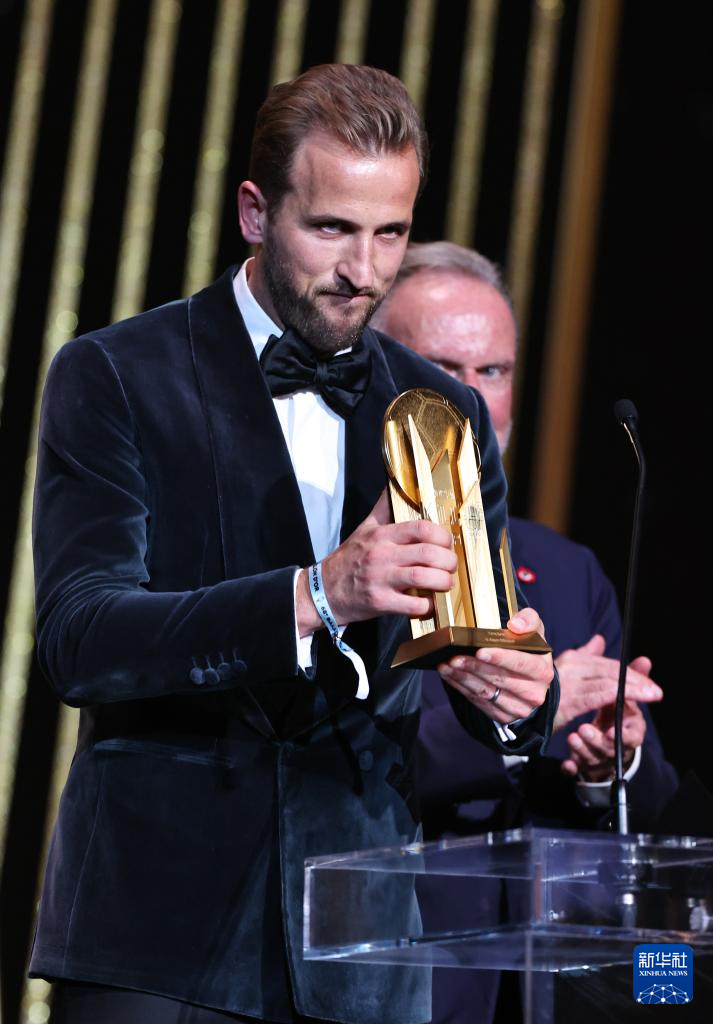 10月28日,英格兰球员凯恩在颁奖典礼上手捧奖杯,他与法国球员姆巴佩共同获得获得象征最佳前锋的“盖德·穆勒奖”。