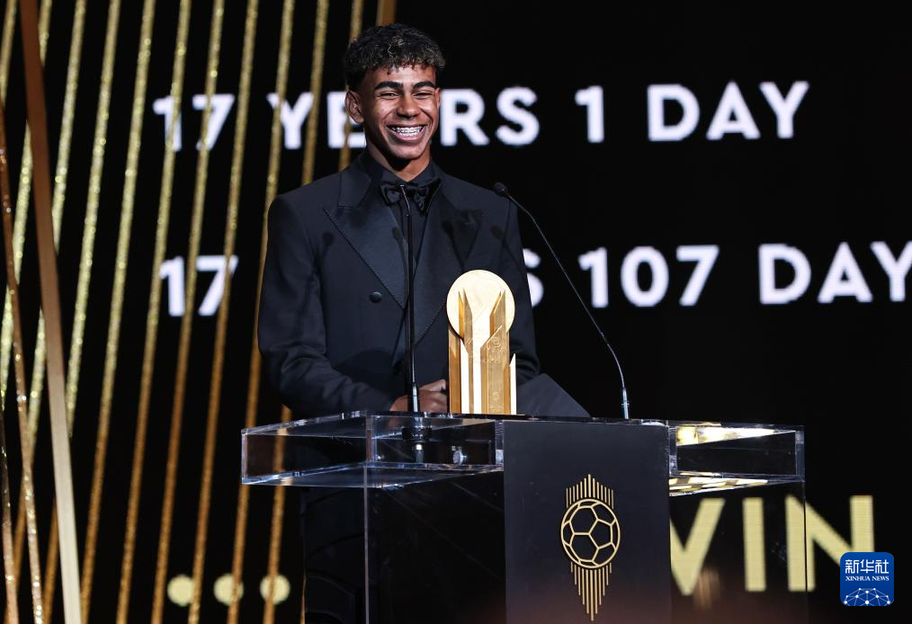 10月28日,摘得象征最佳年轻球员“科帕奖”的西班牙球员亚马尔在颁奖典礼上。