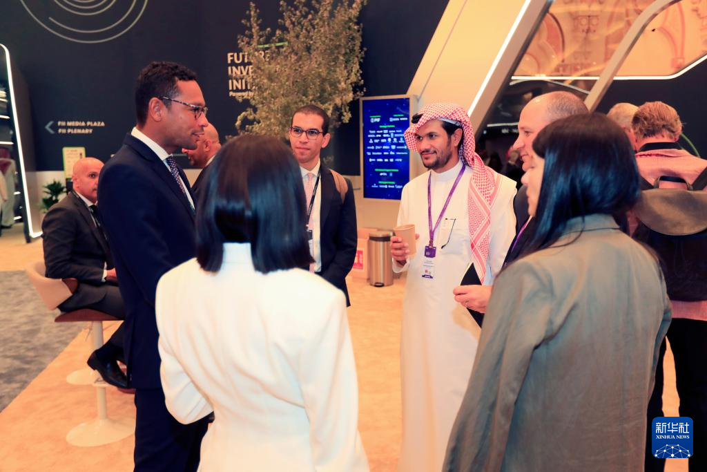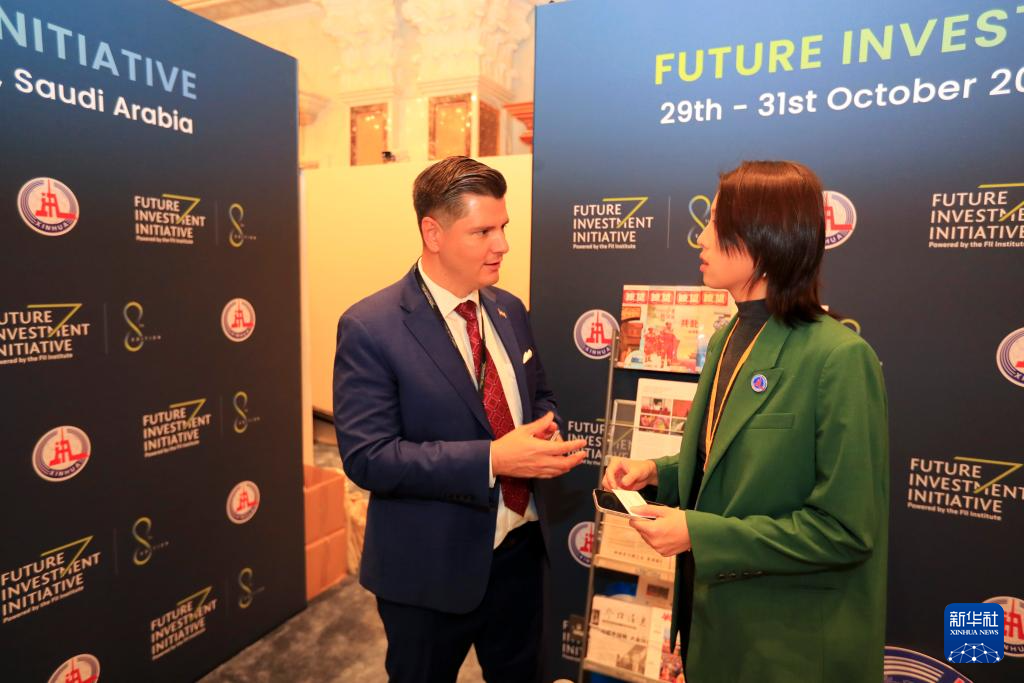 10月29日,在沙特阿拉伯首都利雅得,一名与会者(左)在第八届沙特“未来投资倡议”大会会场的新华社展台与记者交流。