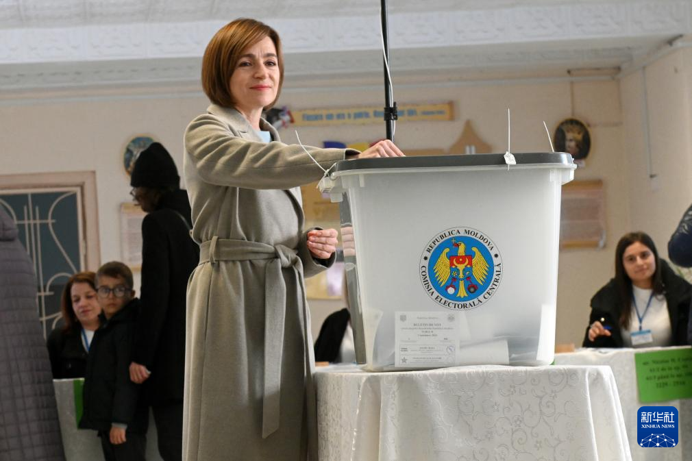 11月3日,摩尔多瓦现任总统马娅·桑杜在首都基希讷乌的一处投票站投票。