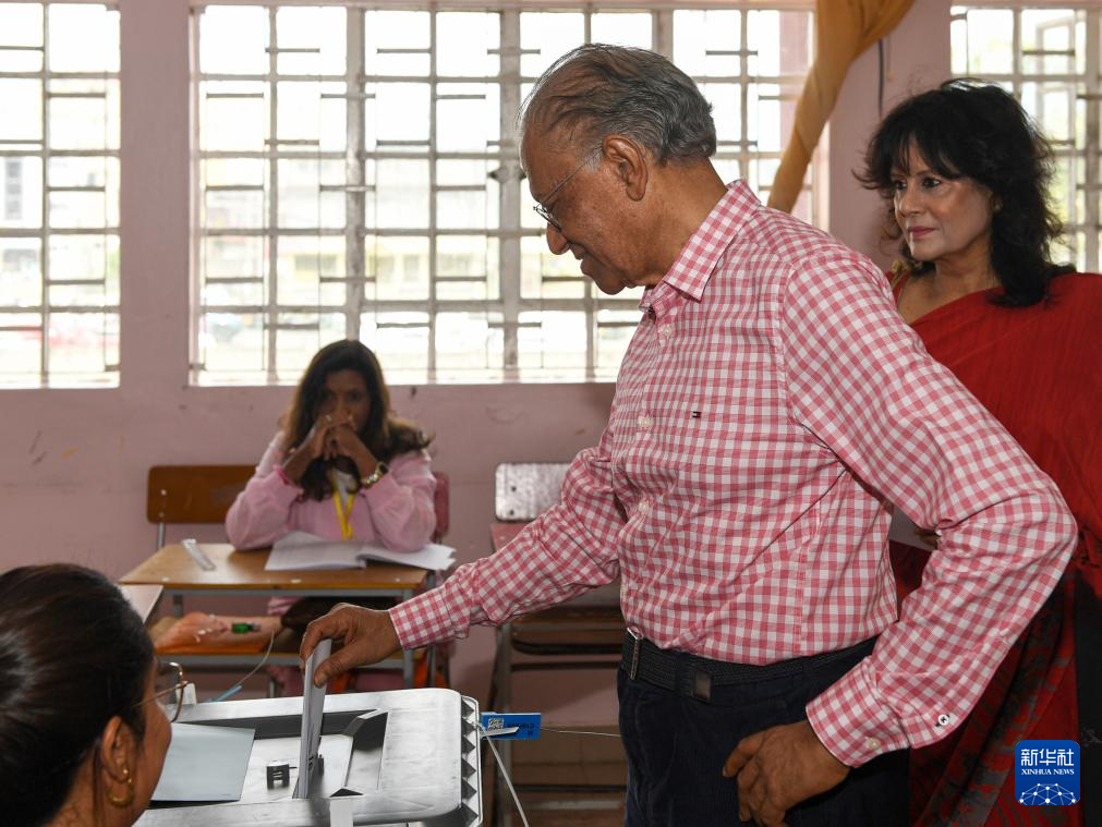 11月10日,现任总理普拉温德·贾格纳特(左)在毛里求斯瓦科阿市的一处投票站投票。