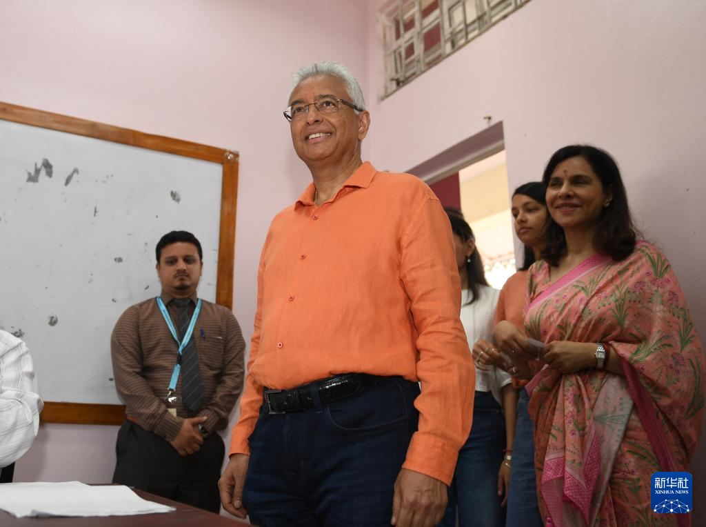11月10日,现任总理普拉温德·贾格纳特(中)在毛里求斯瓦科阿市的一处投票站参加投票。