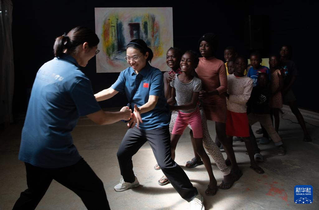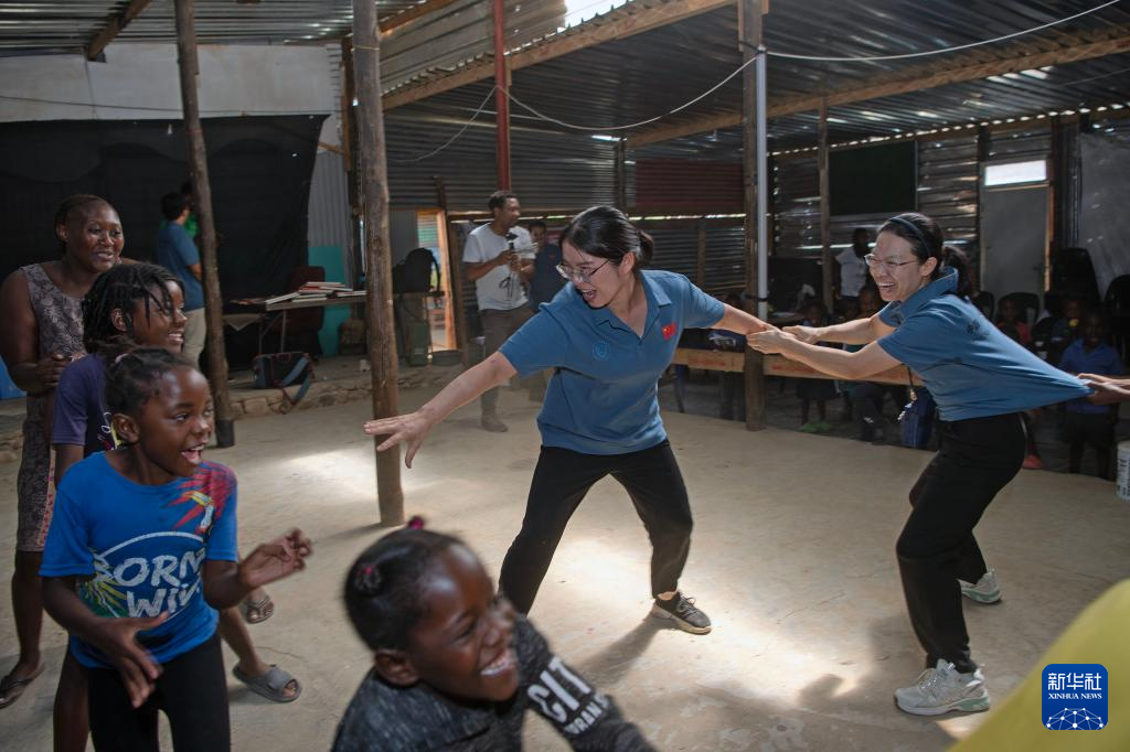 11月20日,在纳米比亚首都温得和克附近的弗兰斯艺术培训中心,中国医生与孩子们做游戏。