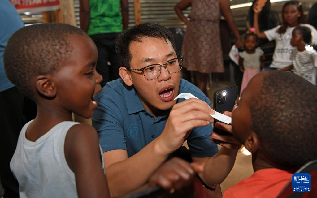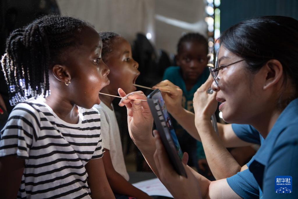 11月20日,在纳米比亚首都温得和克附近的弗兰斯艺术培训中心,中国医生给孩子们进行口腔健康检查。