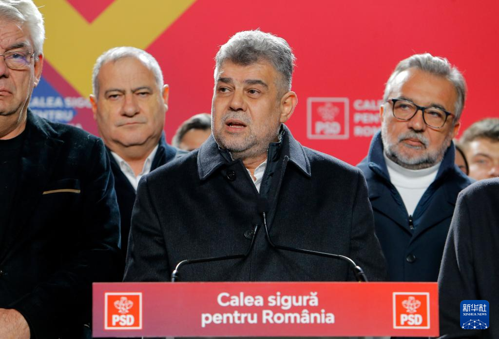 11月24日,在罗马尼亚首都布加勒斯特,罗马尼亚总统选举候选人、现任总理乔拉库(中)对媒体发表讲话。