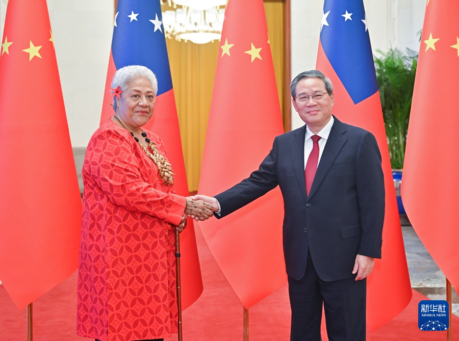 新华社北京11月26日电 国务院总理李强11月26日上午在北京人民大会堂同来华进行正式访问的萨摩亚总理菲娅梅举行会谈。