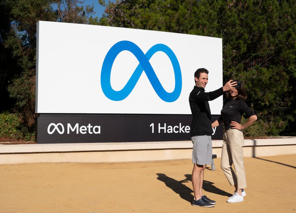 2021年10月28日,在美国旧金山湾区,人们在“元”标志牌前留影。美国社交平台脸书首席执行官马克·扎克伯格当日宣布,脸书公司更名为“元”。新华社发(李建国摄)