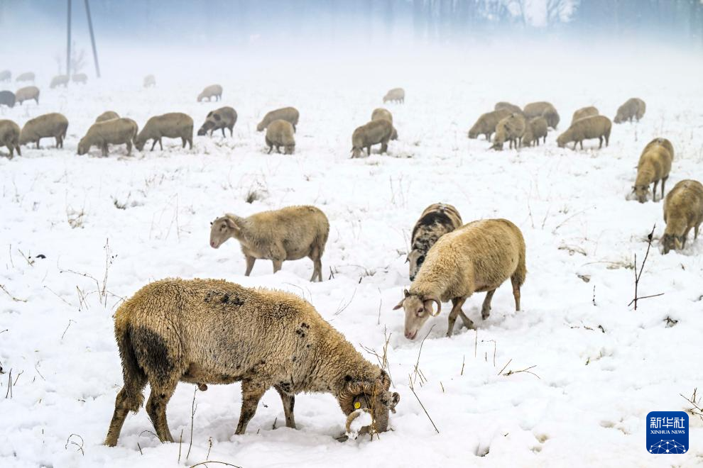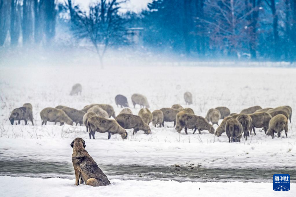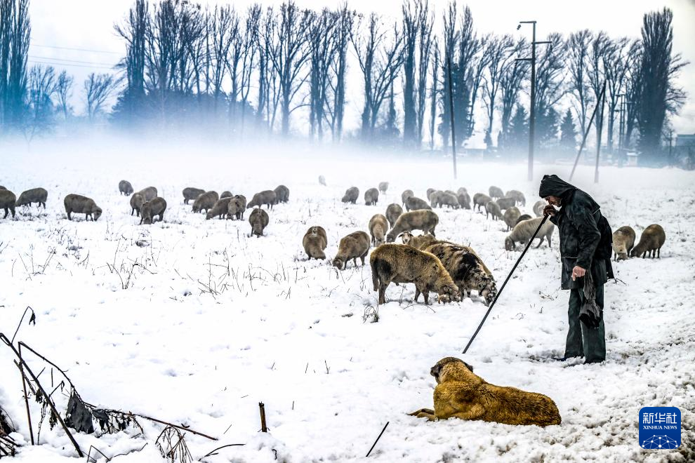 12月1日,羊群在北马其顿首都斯科普里西南约70公里的戈斯蒂瓦尔的雪地里寻找食物。