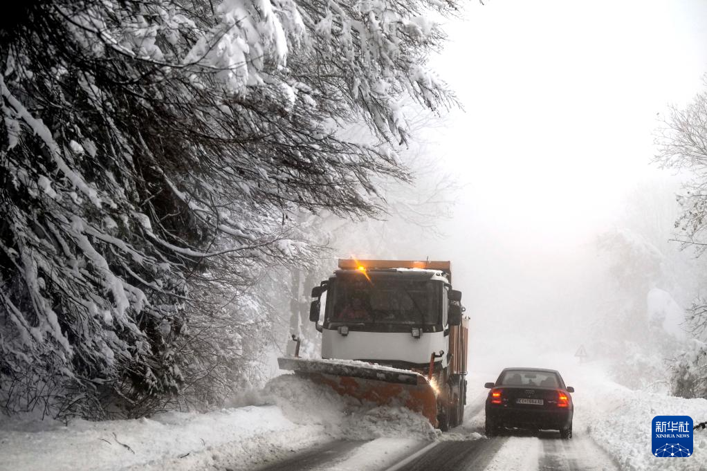 12月1日,北马其顿首都斯科普里西南约90公里的马夫罗沃,一辆除雪车清除道路上的积雪。