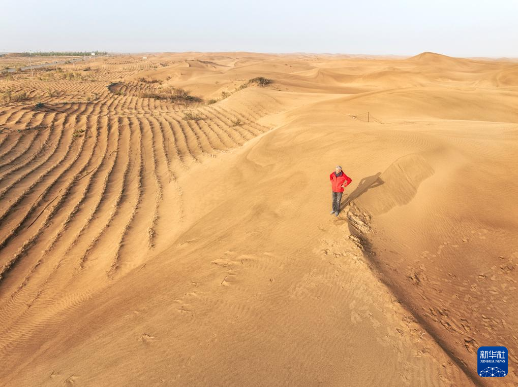 10月13日,在内蒙古巴彦淖尔市磴口县中国林业科学研究院沙漠林业实验中心的基地,卢琦站在治理中的沙地旁。(无人机照片)新华社发(联合国环境规划署供图)