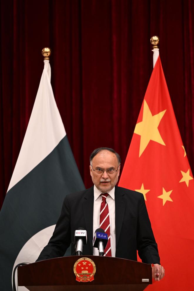 12月13日,在巴基斯坦首都伊斯兰堡,巴基斯坦规划、发展与特别项目部长阿赫桑·伊克巴尔出席中巴经济走廊项目巴方优秀员工颁奖仪式并致辞。新华社发(艾哈迈德·卡迈勒摄)