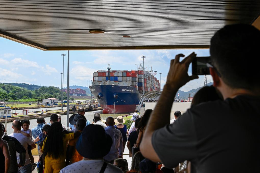 8月28日,在巴拿马首都巴拿马城附近,游客在巴拿马运河的米拉弗洛雷斯船闸游客中心观看货轮通过船闸驶入太平洋。新华社记者李木子摄