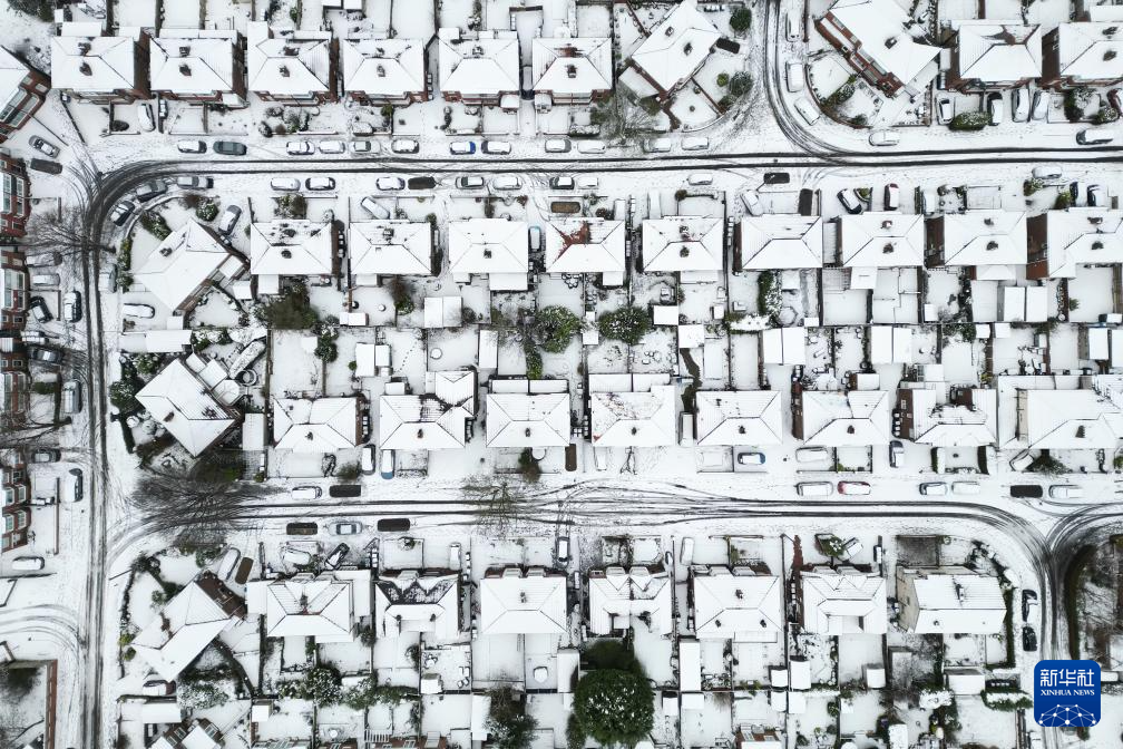 1月5日,在英国曼彻斯特,房屋被积雪覆盖(无人机拍摄)。