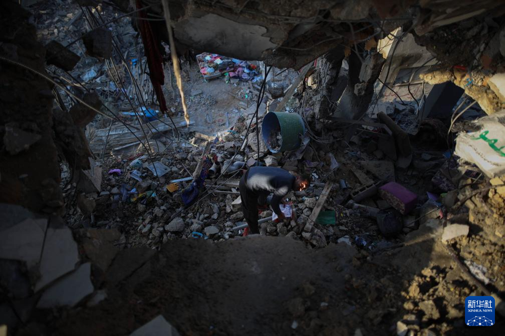 1月6日,在加沙地带中部的布赖杰难民营,一名男子查看遭以军轰炸损毁的房屋。