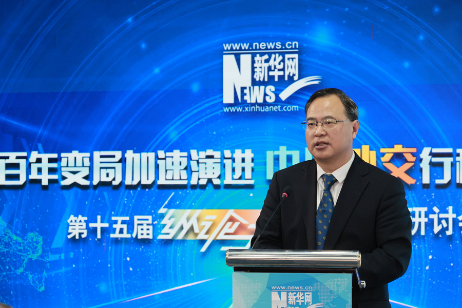 1月2日,新华网第十五届“纵论天下”国际问题研讨会在北京新华网总部举办。图为北京大学国际关系学院教授王勇在进行主题演讲。新华网 杨霁昕 摄