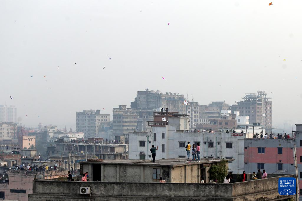 1月14日,在孟加拉国达卡,人们在屋顶放风筝。