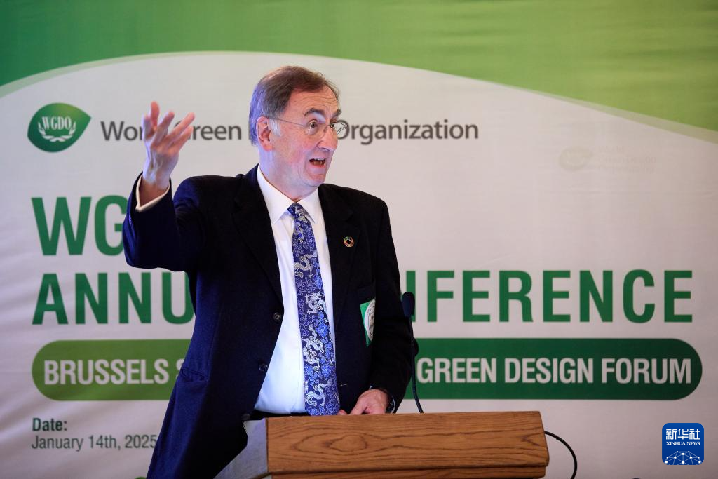 1月14日,在比利时布鲁塞尔,联合国气候变化事务前助理秘书长亚诺什·帕斯托尔在世界绿色设计组织年会暨布鲁塞尔峰会上致辞。