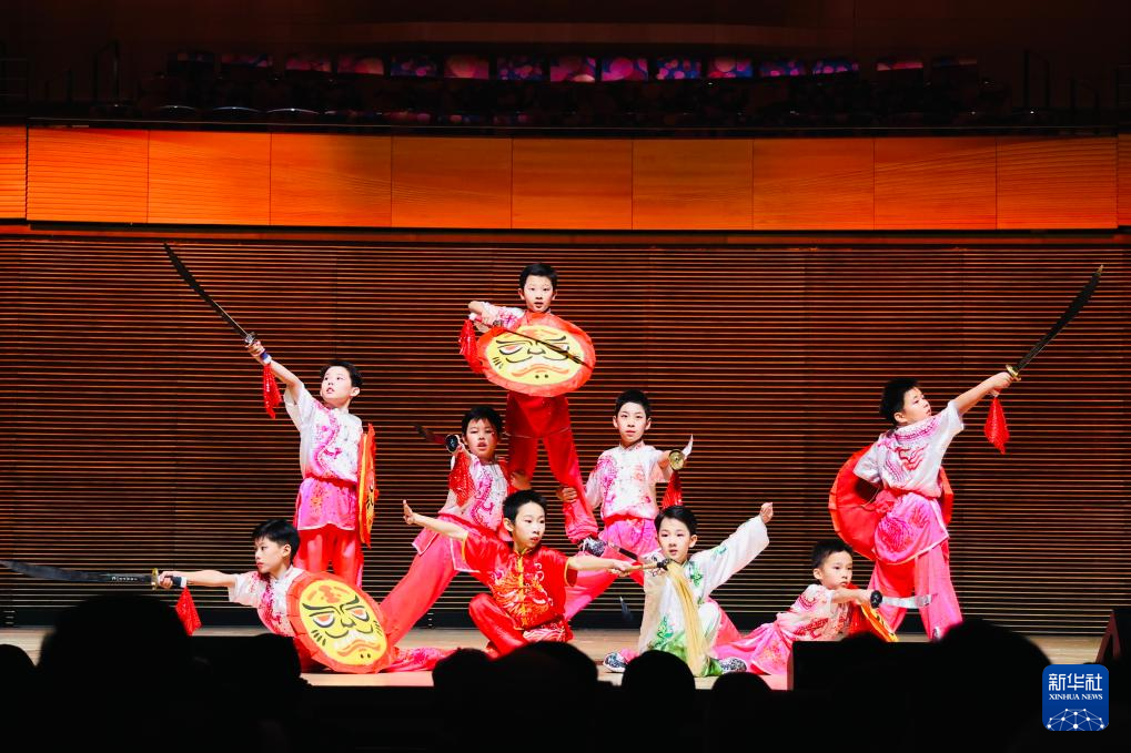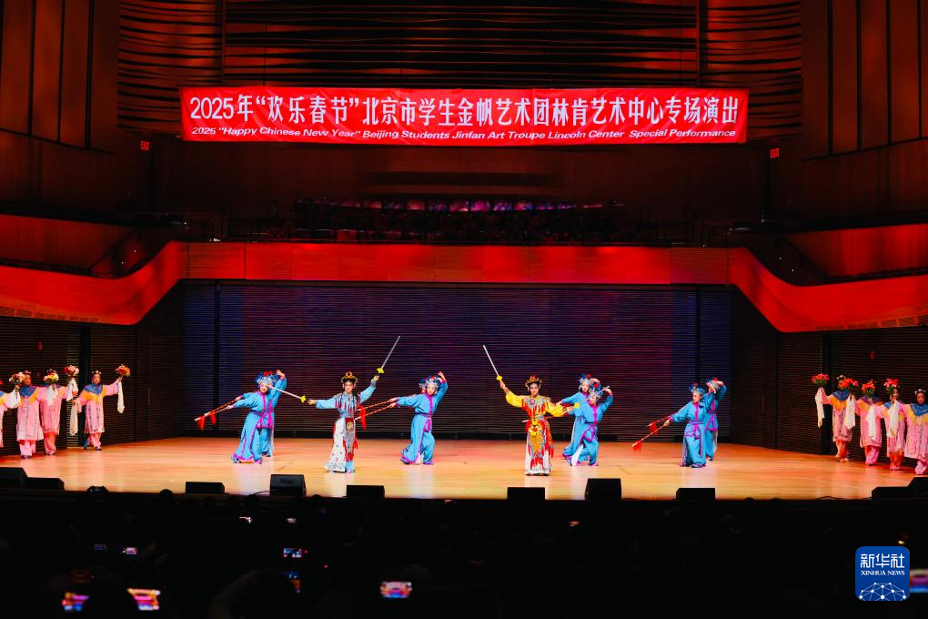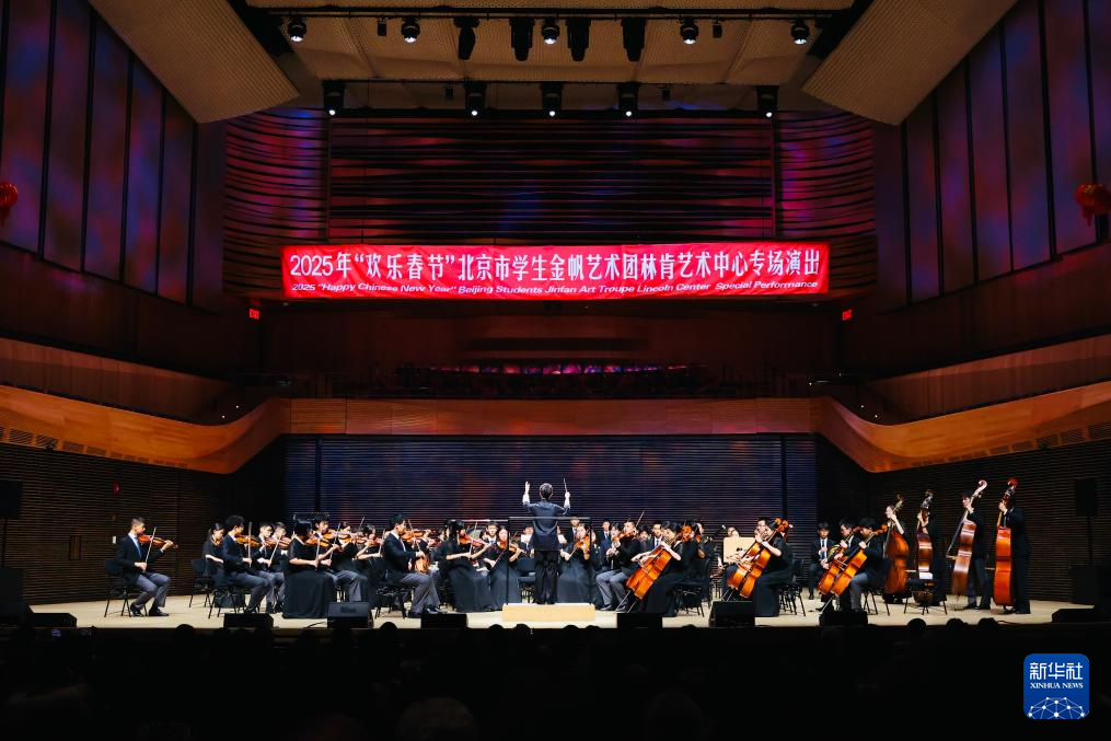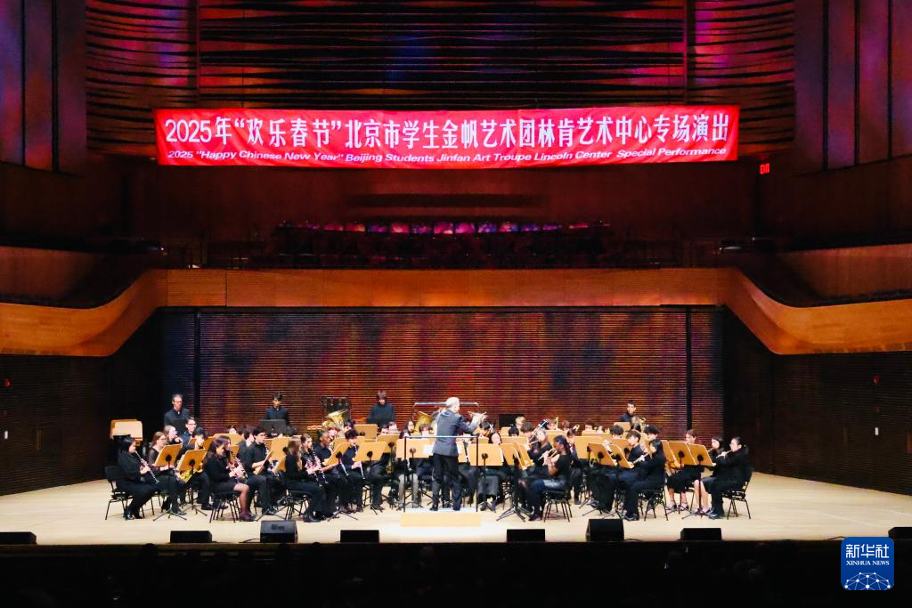 中国北京市学生金帆艺术团与联合国国际学校管乐团的400名中小学生20日晚在美国纽约林肯艺术中心联袂奉献了2025年“欢乐春节”专场演出。