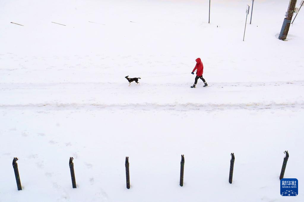 1月21日,在美国路易斯安那州新奥尔良,一名女子在暴风雪中遛狗。