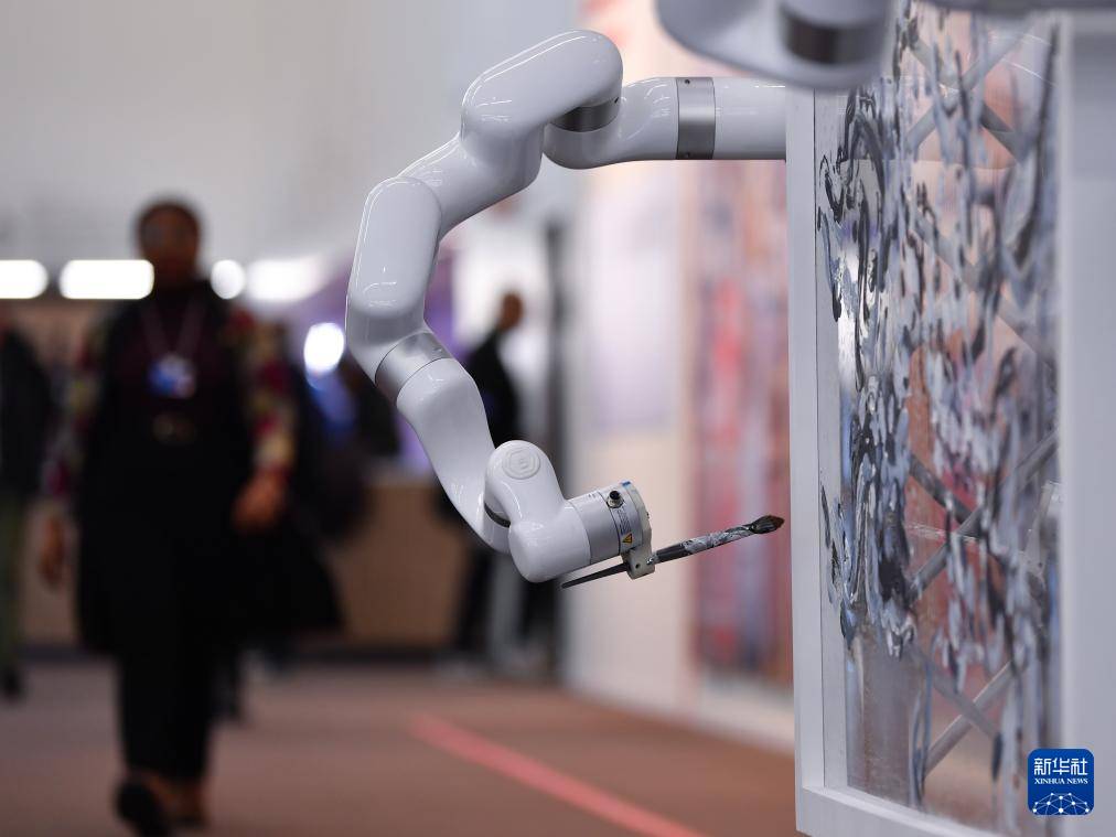 这是1月23日在瑞士达沃斯世界经济论坛2025年年会会场拍摄的作画机器人手臂。