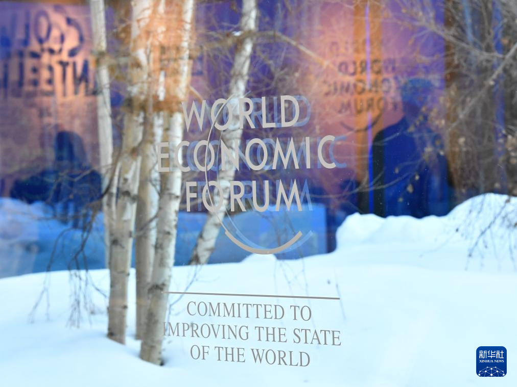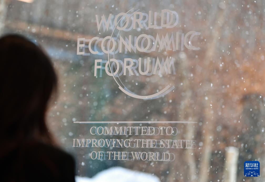 这是1月23日在瑞士达沃斯拍摄的雪花映衬下的世界经济论坛标识。