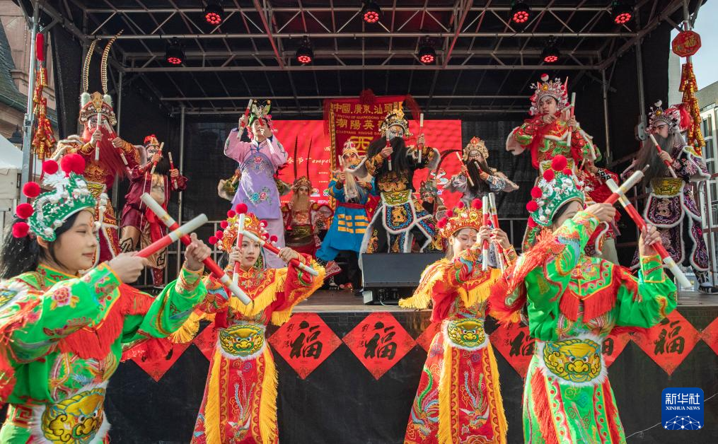 1月31日,在德国法兰克福市中心卫戍广场,潮汕英歌舞队在庙会上表演。
