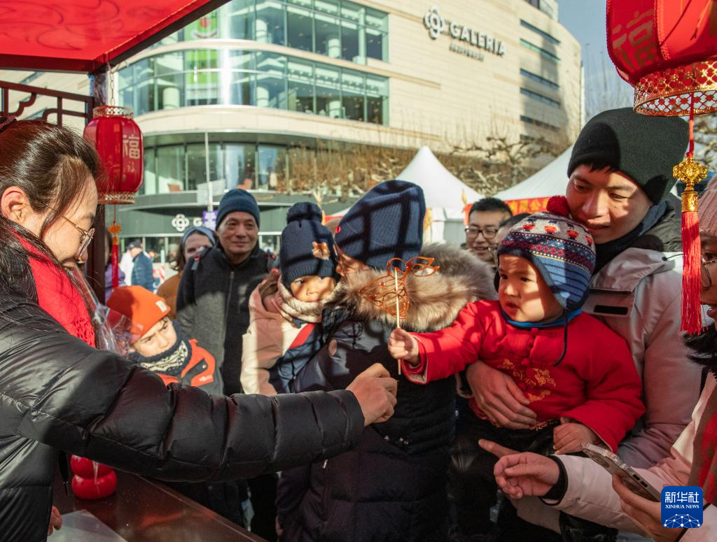 1月31日,在德国法兰克福市中心卫戍广场,一名摊主将现场制作的糖画递给一名儿童。