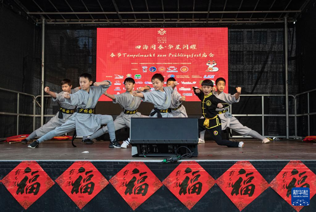 1月31日,在德国法兰克福市中心卫戍广场,演员表演少林功夫。