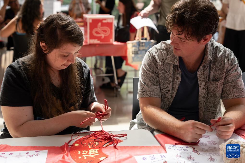 2月1日,人们在新西兰奥克兰美术馆举办的春节庆祝活动上体验编制中国结。