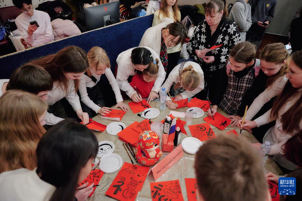 2月3日,俄罗斯圣彼得堡学生在中小学春节联欢节上体验中国书法。当日,由中国驻圣彼得堡总领馆与圣彼得堡“孔子”东方语言文化学院举办的第九届中小学春节联欢节在俄罗斯圣彼得堡举行,近千名中小学生和家长欢聚一堂,共庆中国新春佳节。