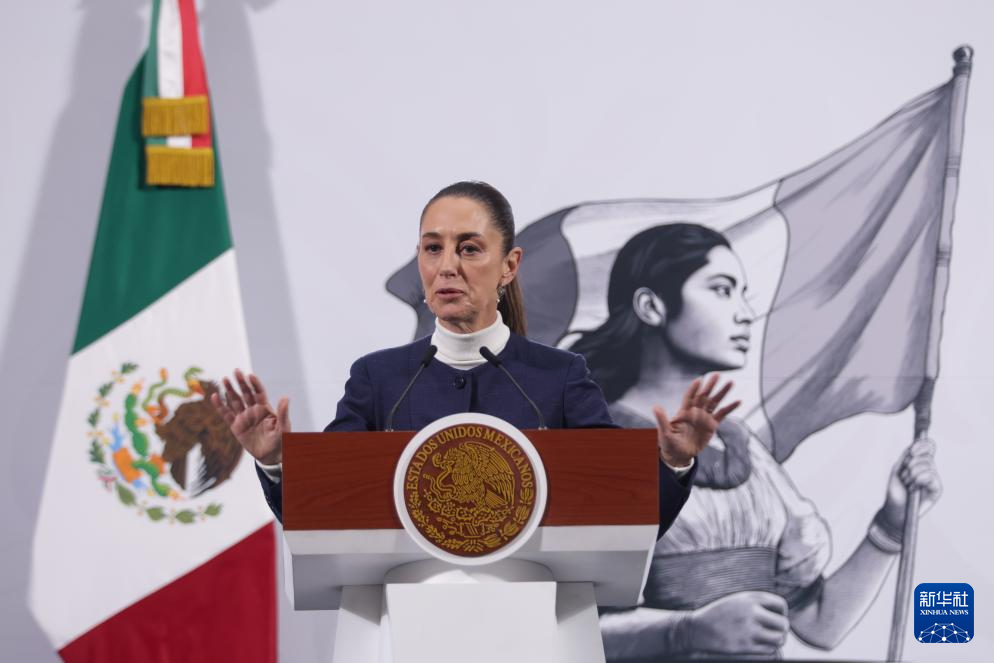 2月3日,墨西哥总统辛鲍姆在首都墨西哥城出席例行新闻发布会。