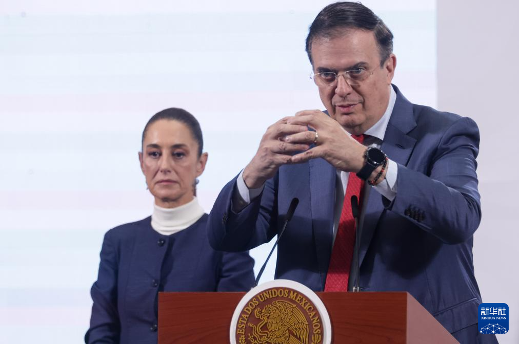 2月3日,墨西哥总统辛鲍姆(左)和经济部长马塞洛·埃布拉德在首都墨西哥城出席例行新闻发布会。