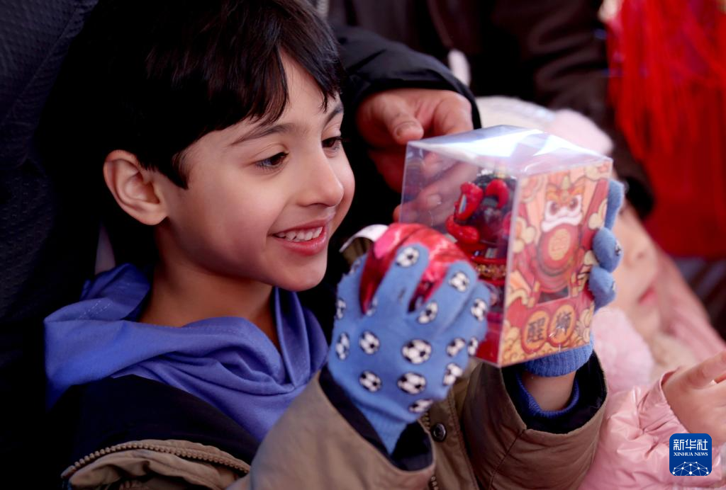 2月2日,在英国伦敦,一名男孩购买春节玩具。