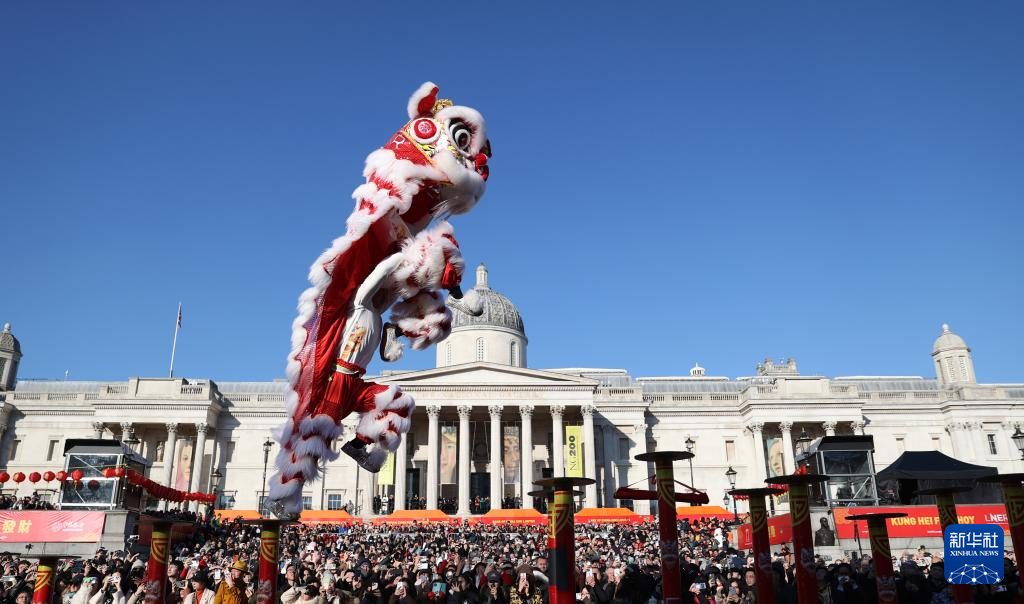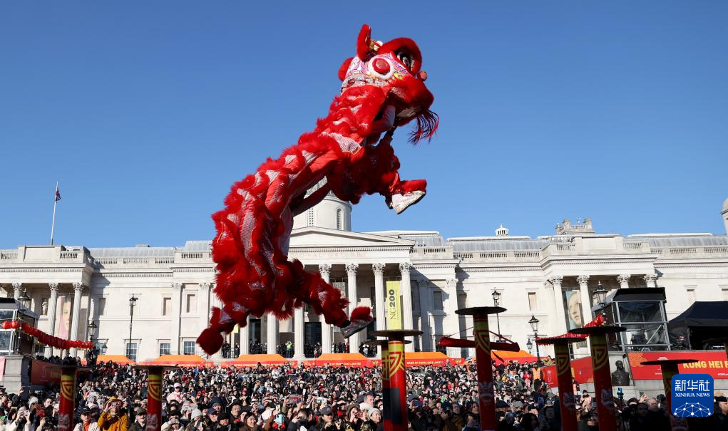 2月2日,在英国伦敦市中心的特拉法加广场,演员表演舞狮。