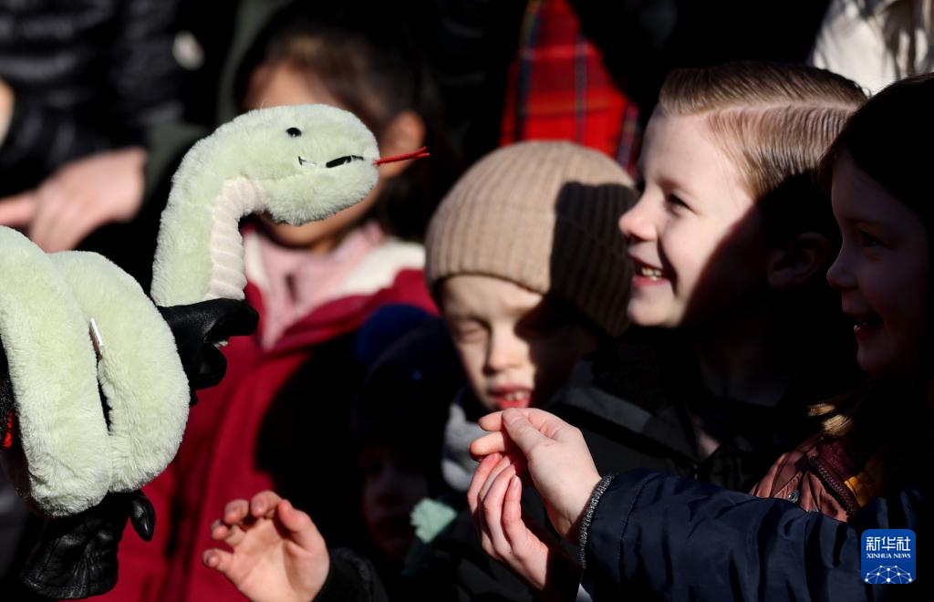 2月2日,在英国伦敦,一名女孩在新春巡游活动上与玩偶蛇互动。