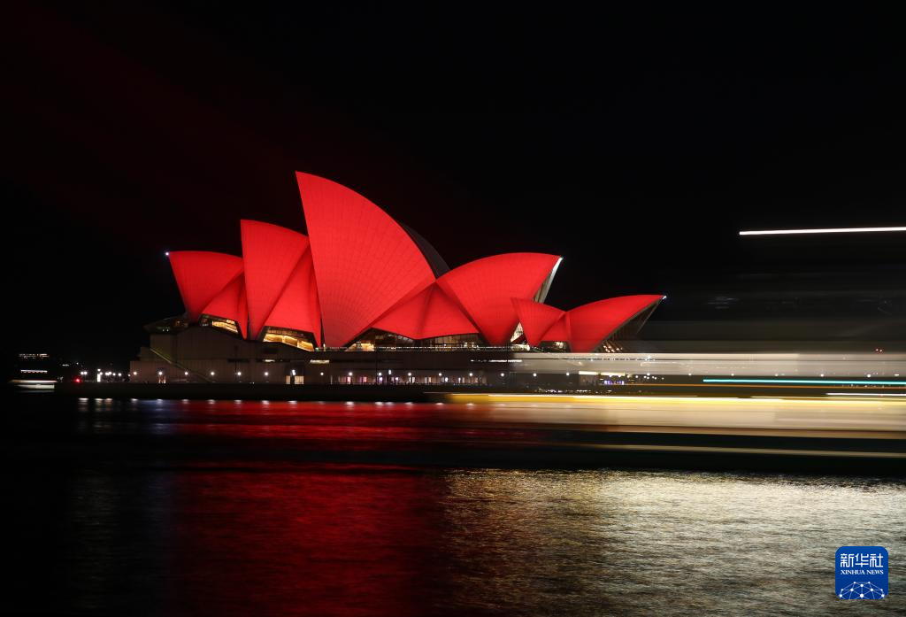 2月4日,澳大利亚悉尼歌剧院点亮“中国红”,庆祝中国农历新年。