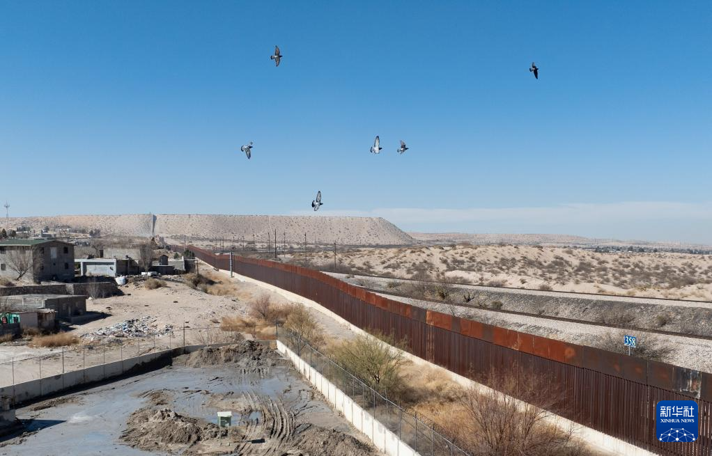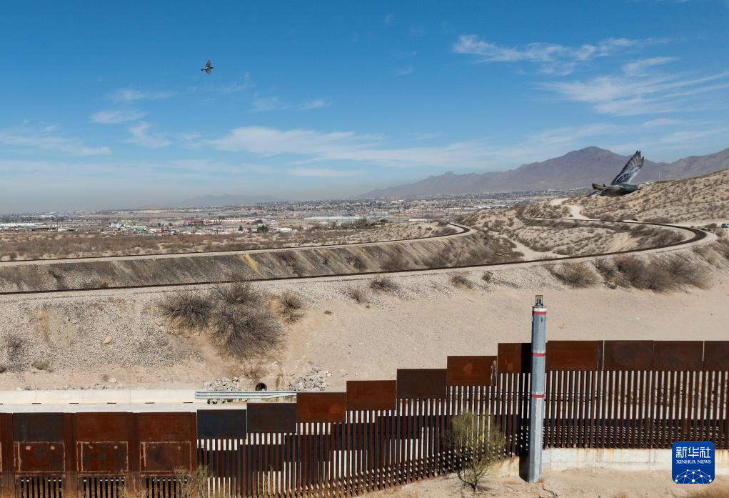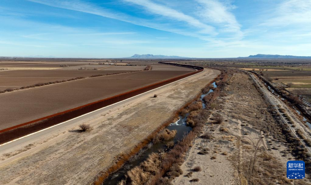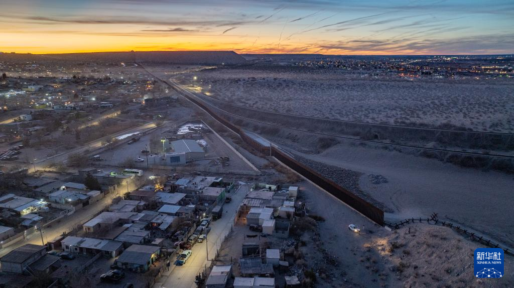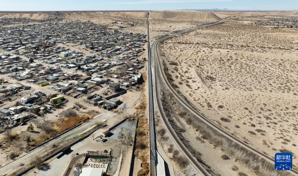 这是2月3日在墨西哥奇瓦瓦州华雷斯市航拍的墨美边境墙,墙的右侧是墨西哥。