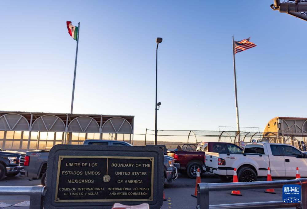 2月2日,墨西哥奇瓦瓦州华雷斯市,车辆驶过一处边检站的墨美界碑。