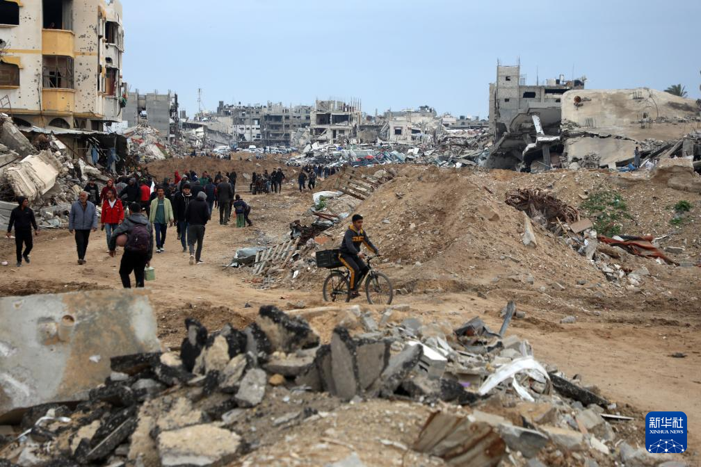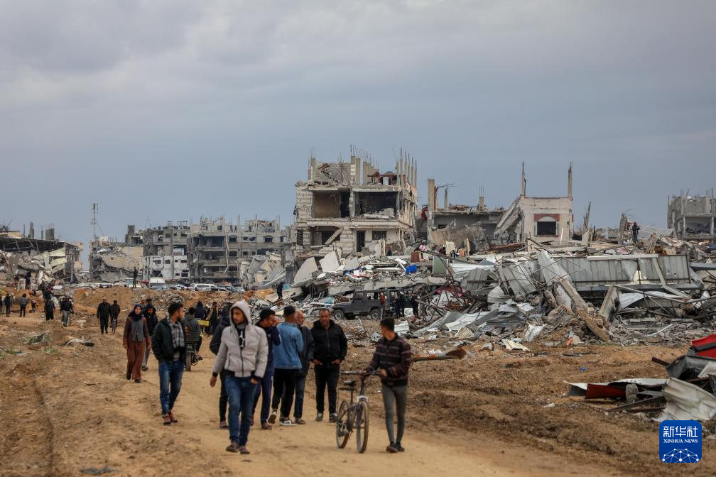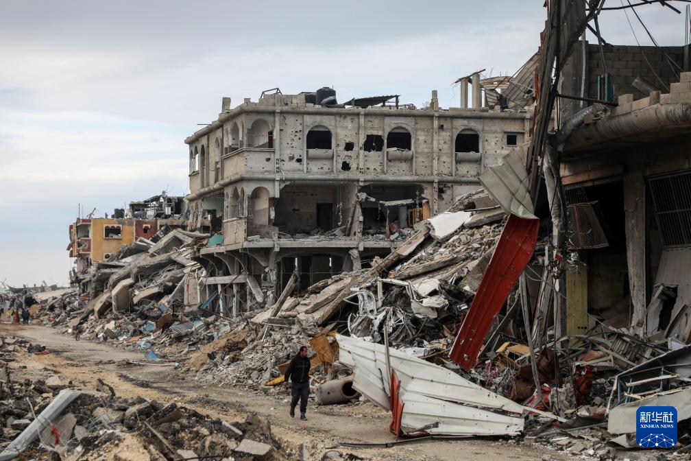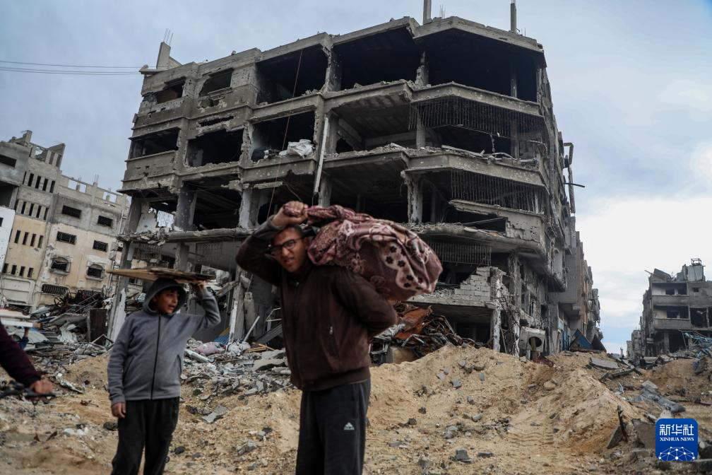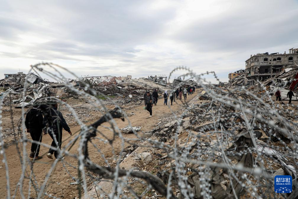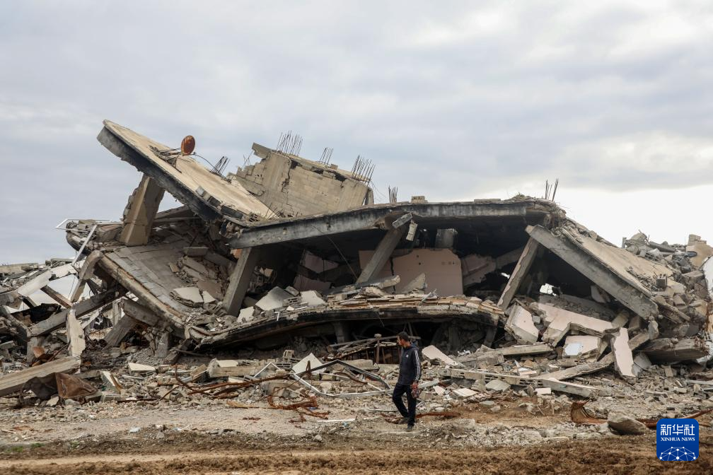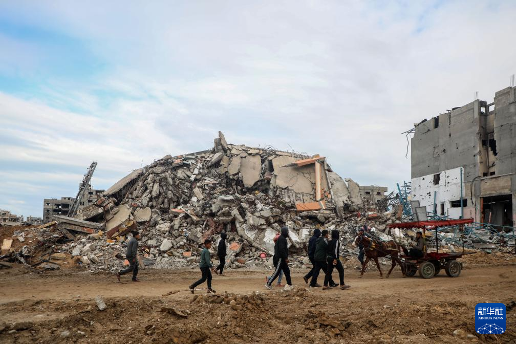 2月9日,在加沙地带内察里姆走廊附近,巴勒斯坦人经过建筑废墟。