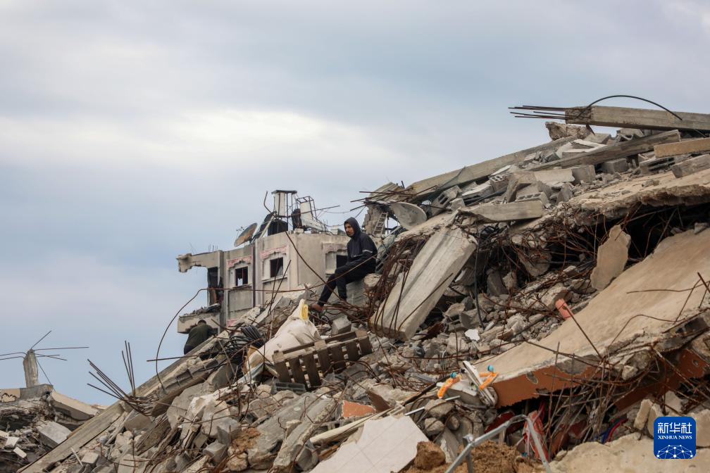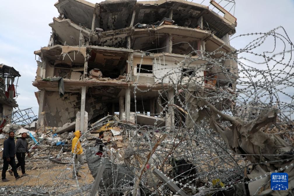 2月9日,巴勒斯坦人站在加沙地带内察里姆走廊附近的废墟上眺望。