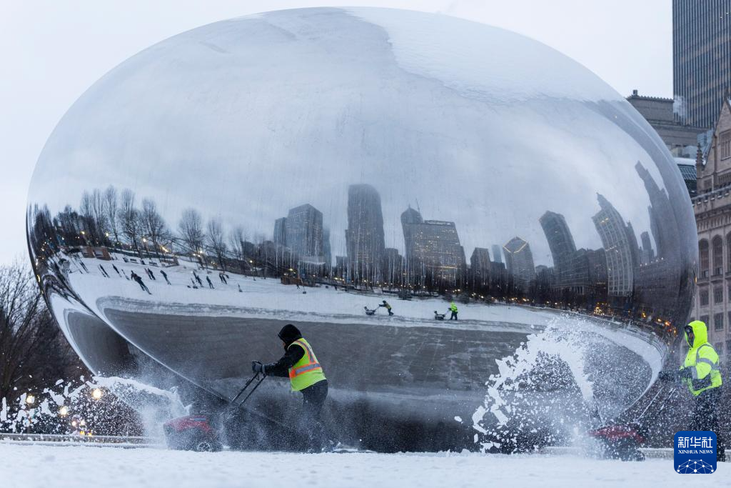 2月12日,工人在美国芝加哥市中心清扫积雪。