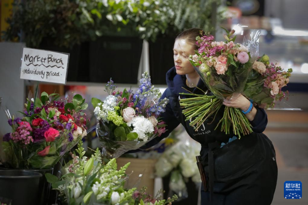 2月13日,在加拿大温哥华,一名花店员工为顾客准备情人节花束。