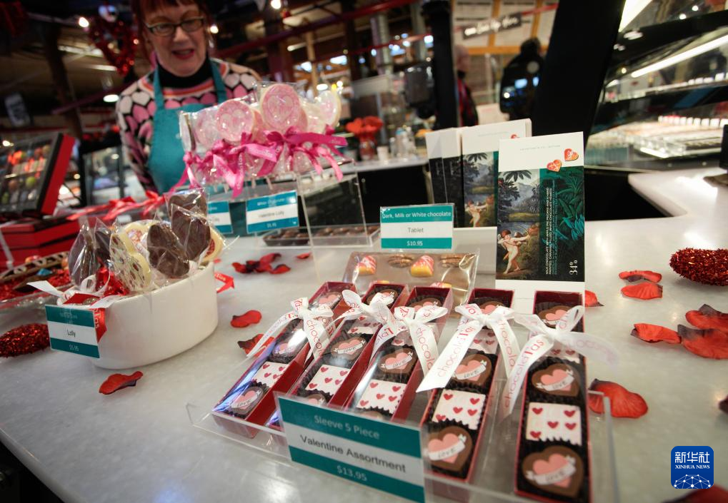 2月13日,在加拿大温哥华,一家巧克力店展示情人节主题的巧克力产品。