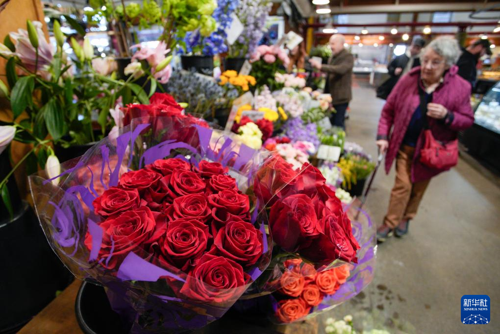 2月13日,在加拿大温哥华,玫瑰花束陈列在一家花店门前。