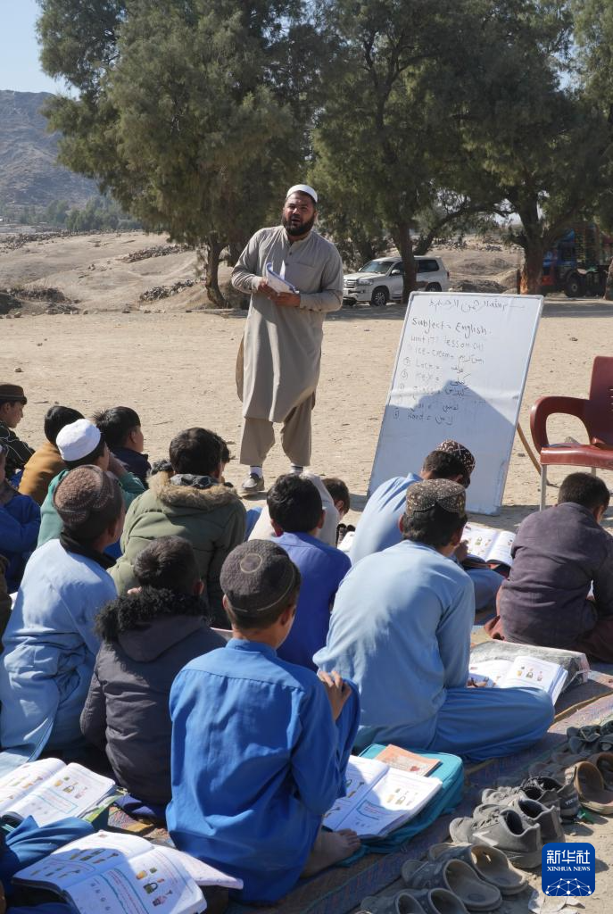 2月12日,孩子们在阿富汗东部楠格哈尔省贾拉拉巴德一处露天学校上英语课。