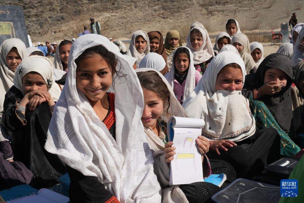 2月12日,在阿富汗东部楠格哈尔省贾拉拉巴德一处露天学校,一名女孩的绘本上画着课桌图案。