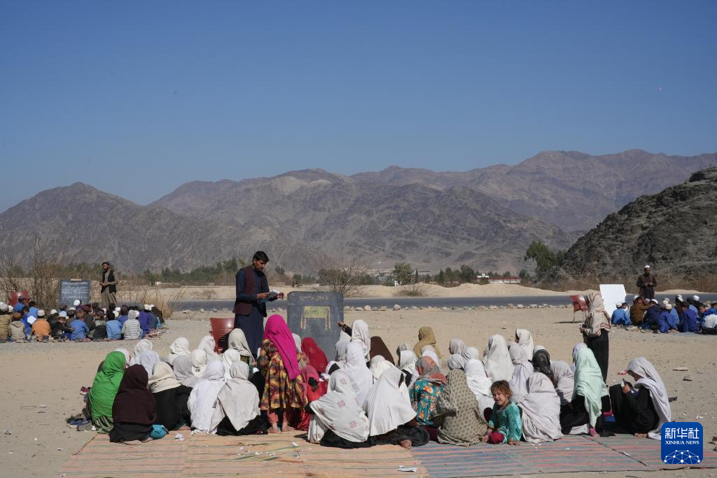 2月12日,在阿富汗东部楠格哈尔省贾拉拉巴德一处露天学校,学生们席地而坐听讲。