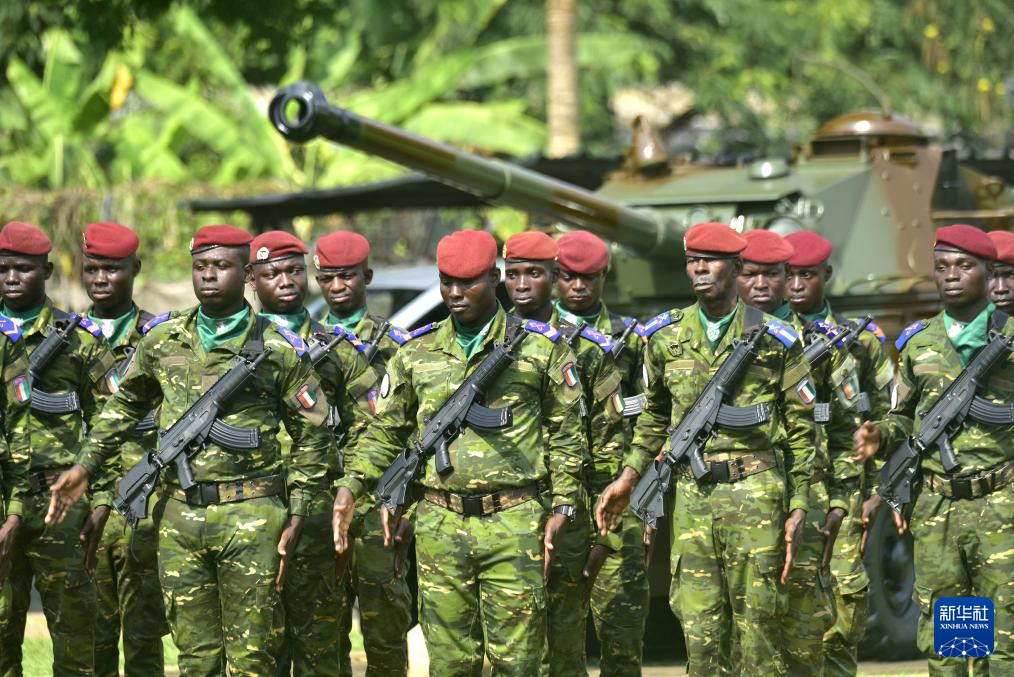 这是2月20日在科特迪瓦经济首都阿比让的布埃港拍摄的军事基地移交仪式现场。