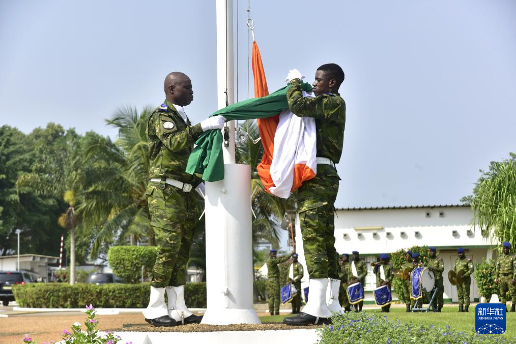 2月20日,在科特迪瓦经济首都阿比让的布埃港,科特迪瓦士兵在军事基地移交仪式上升科特迪瓦国旗。