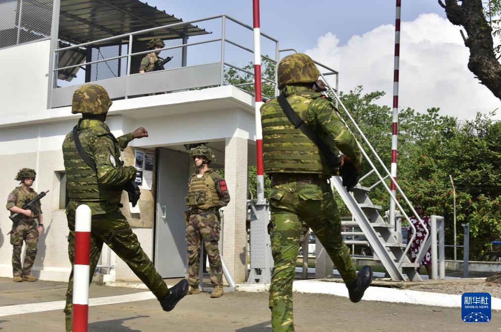 这是2月20日在科特迪瓦经济首都阿比让拍摄的布埃港军事基地入口处的法国军人和科特迪瓦军人。